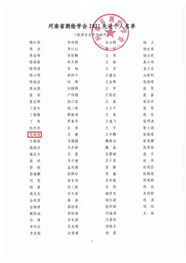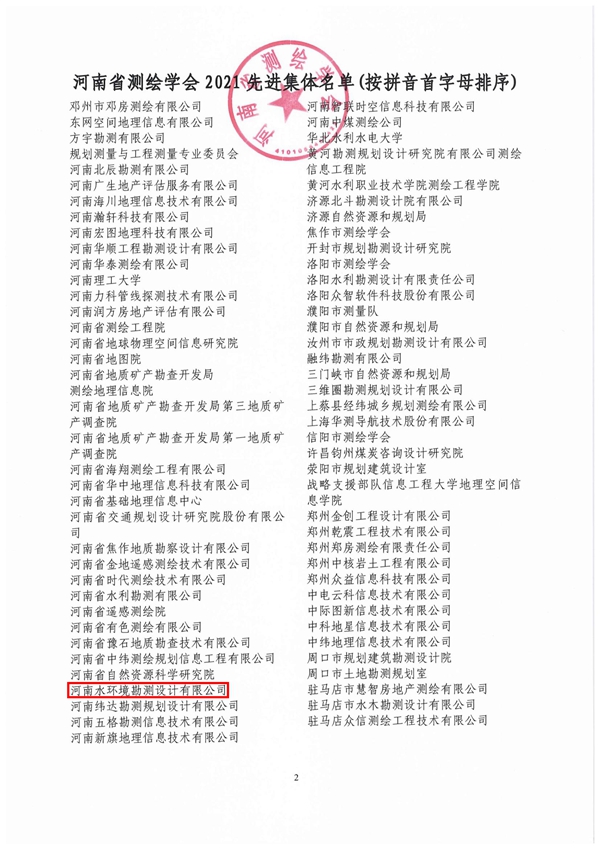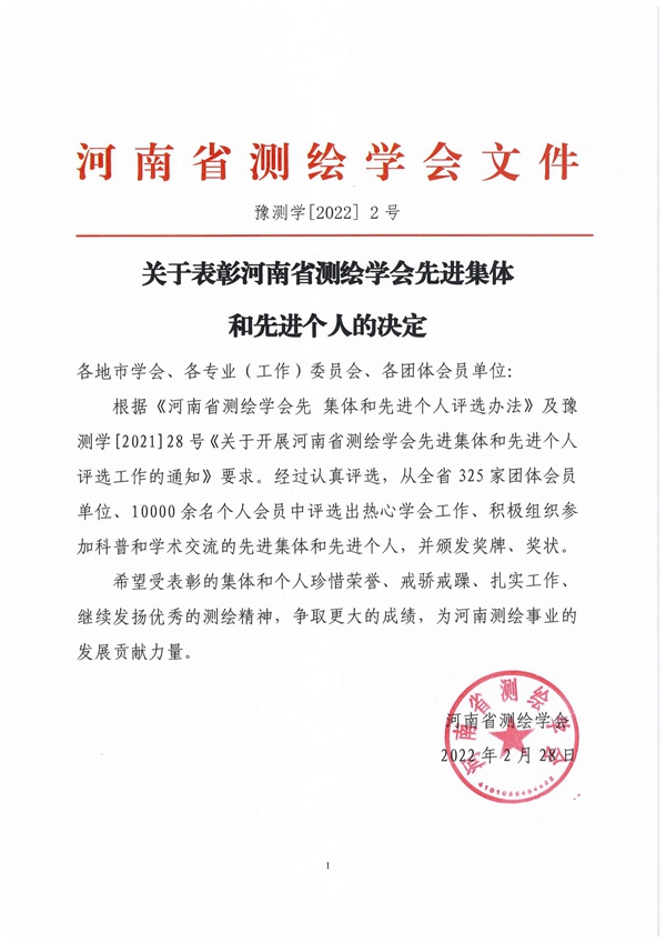2月28日,我公司被河南省測繪學(xué)會評為河南省測繪學(xué)會先進(jìn)集體榮譽稱號,公司范海波被評為先進(jìn)個人,這充分說明了省測繪學(xué)會對我公司測繪工作的肯定,在今后的工作中,我們將繼續(xù)發(fā)揮測繪科技優(yōu)勢,積極開拓市場,為開創(chuàng)新時期測繪工作新局面不懈努力!