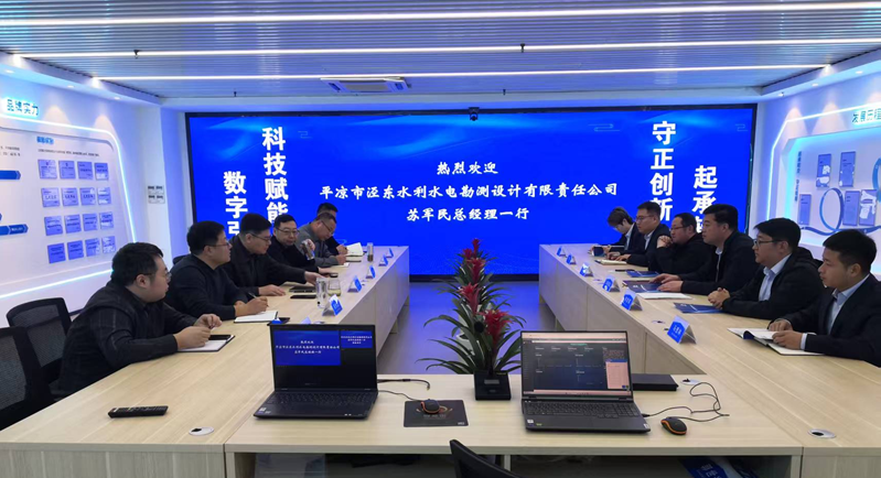 2025 年 3 月 10 日,平涼市涇東水利水電勘測設計有限責任公司總經理蘇軍民率 6 人團隊到訪我司,公司董事長張文敏、總經理趙宗銳等6人參與陪同交流,張文敏董事長對蘇軍民總經理的到來表示熱烈歡迎,隨后賓主雙方簡單介紹公司情況,并由趙宗銳總經理介紹公司發展歷程和轉型發展情況,會議期間雙方圍繞設計院數字化轉型、數字化業務發展、市場拓展、質量控制、考核管理等方面開展深入交流,并分享公司在智慧水務方面應用成果及技術。