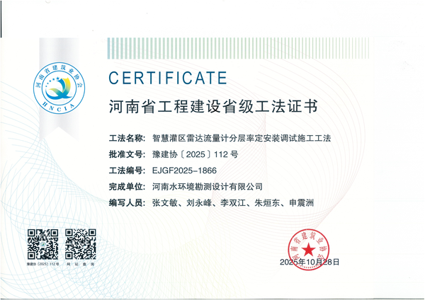 近日河南省建筑業(yè)協(xié)會(huì)發(fā)布《關(guān)于公布2025年度第二批河南省省級(jí)工法的通知》(豫建協(xié)【2025】112號(hào)),公司申報(bào)的河南省工程建設(shè)省級(jí)工法——“‘智慧灌區(qū)雷達(dá)流量計(jì)分層率定安裝調(diào)試施工工法”獲批!這是我司2025年繼“‘中試、測(cè)試基地’輔助水利物聯(lián)網(wǎng)安裝調(diào)試施工工法”后,再次獲得一項(xiàng)省級(jí)工法證書(shū)。